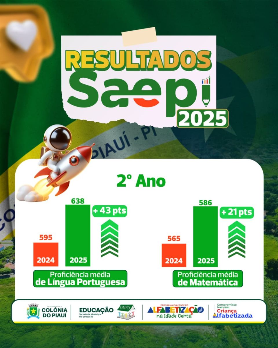 Os resultados do Sistema de Avaliação Educacional do Piauí (Saepi) 2025 indicam avanço no desempenho dos estudantes do 2º ano do ensino fundamental da rede municipal de Colônia do Piauí. Os dados mostram elevação nas médias de proficiência em Língua Portuguesa e Matemática, evidenciando o desenvolvimento da aprendizagem nas etapas iniciais da educação básica.