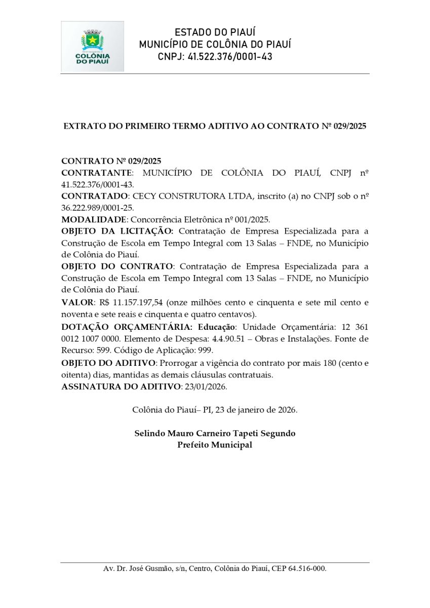 AVISO DO EXTRATO DO PRIMEIRO TERMO ADITIVO AO CONTRATO Nº 029/2025