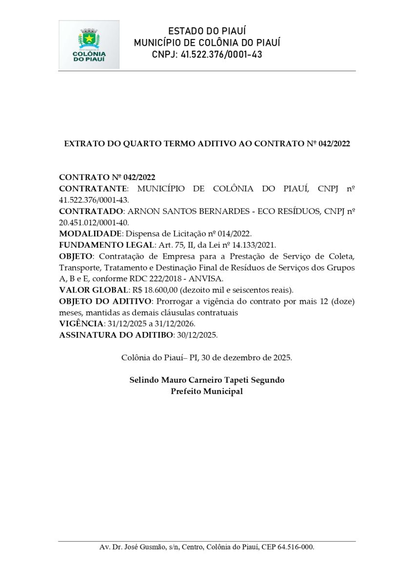 AVISO EXTRATO DO QUARTO TERMO ADITIVO AO CONTRATO Nº 042/2022
