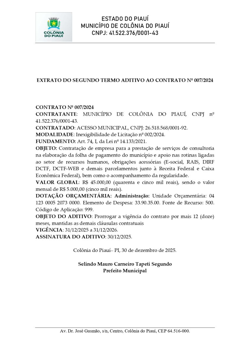 AVISO EXTRATO DO SEGUNDO TERMO ADITIVO AO CONTRATO Nº 007/2024