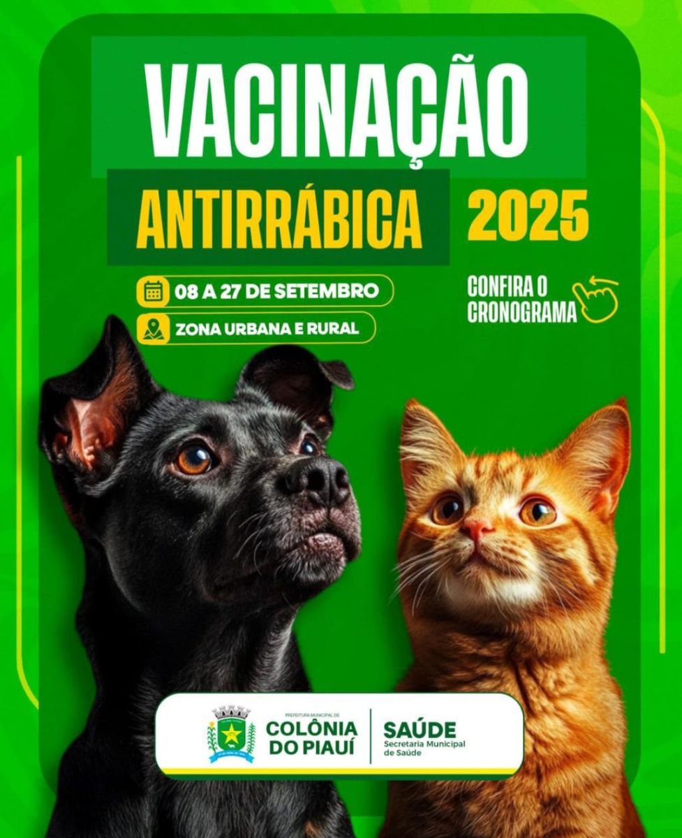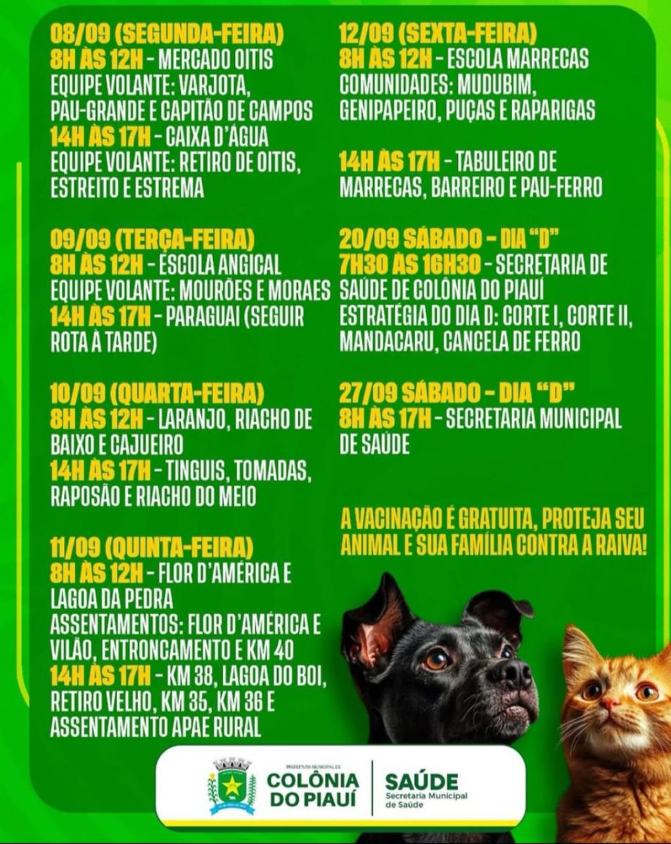 A Secretaria Municipal de Saúde de Colônia do Piauí divulgou o cronograma da campanha de vacinação antirrábica de cães e gatos. A mobilização acontece entre os dias 8 e 27 de setembro, em pontos fixos e com equipes volantes nas comunidades.