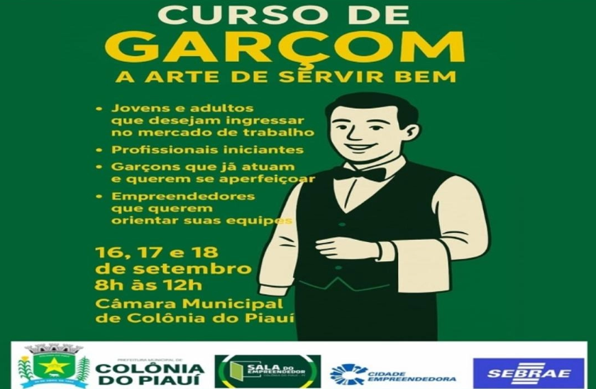 A Prefeitura de Colônia do Piauí, por meio da Sala do Empreendedor e em parceria com o Sebrae, promove nos dias 16, 17 e 18 de setembro o Curso de Garçom – A Arte de Servir Bem. A capacitação será realizada na Câmara Municipal, com carga horária total de 20 horas. Nos dias 16 e 17, as aulas ocorrerão das 8h às 12h e das 14h às 18h, e no dia 18, das 8h às 12h.