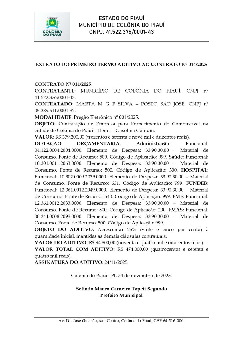 EXTRATO DO PRIMEIRO TERMO ADITIVO AO CONTRATO Nº 014/2025