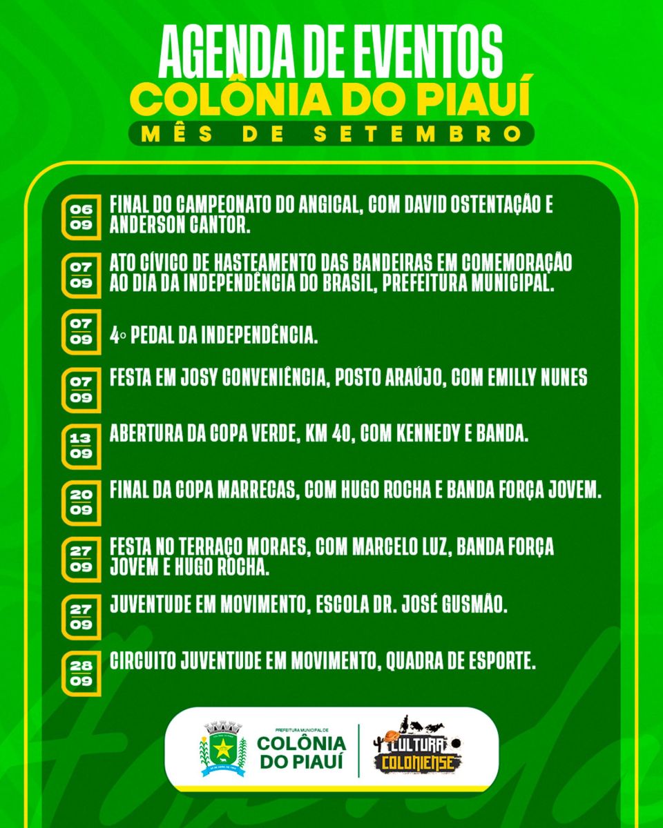 A Prefeitura de Colônia do Piauí, por meio da Secretaria de Cultura, apresentou o calendário de eventos de setembro. A programação celebra a independência do Brasil com atividades culturais, esportivas e festivas, reunindo a comunidade em momentos de lazer, convivência e civismo.